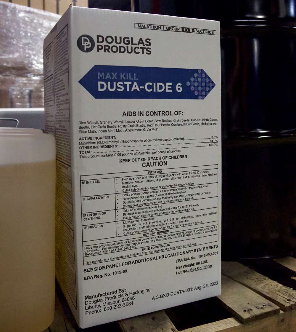 Dusta-Cide® 6 is a 6% malathion dust grain protectant that provides reliable control of weevils, borers, beetles, and moths in stored wheat, corn, oats, barley, and rye. Apply during loading, surface treatment, or after fumigation to keep grain clean and market-ready.